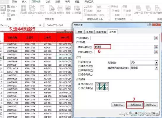 解决方法:【页面布局】——【打印标题】——【工作表】——【顶端标题行】——【选中标题行】——【打印预览】