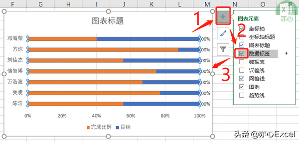 首先选中所有蓝色条,点击图标右上方加号「图表元素」,并勾选「图表元素」复选框。然后适当调整图表大小使得数据可以完全显露出。