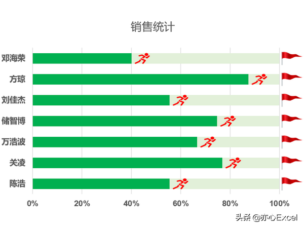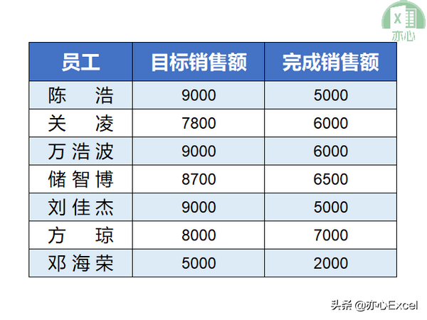 结果应该很显然,我想大多数人都应该选择上面的图,而不是选择下面的表,因为这个数据表很难直观体现出每个员工的完成情况以及员工中之间的对比。