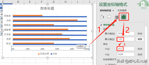 然后双击横坐标,调出设置坐标轴格式窗口,点击「坐标轴选项」,设置「边界」下「最大值」为「1」,设置「单位」下「大」为「0.2」。