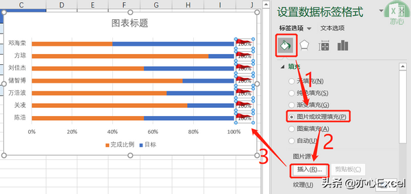 选中数据标签,设置「填充与线条」中填充为「图片或纹理填充」,并修改「图片源」插入事先准备好的小旗子图片。