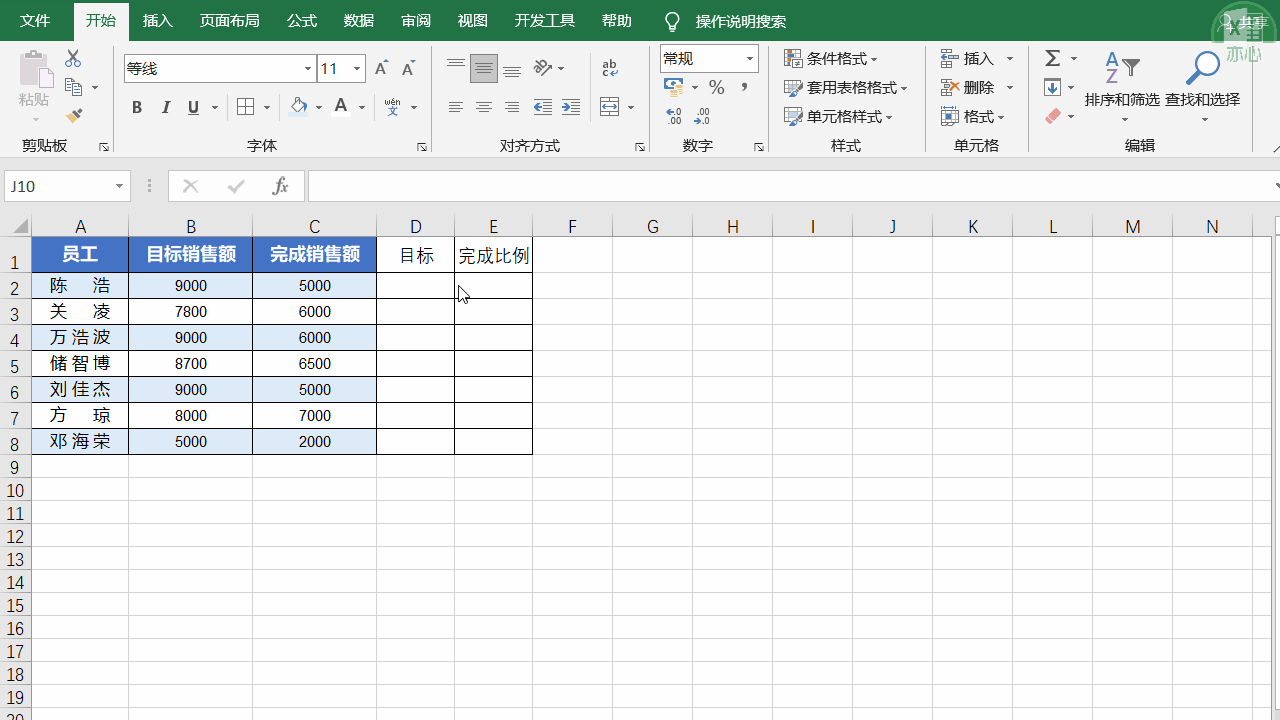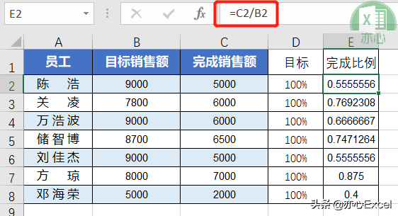 然后选择E2:E8单元格区域,设置单元格格式为百分比,小数位数为0位。