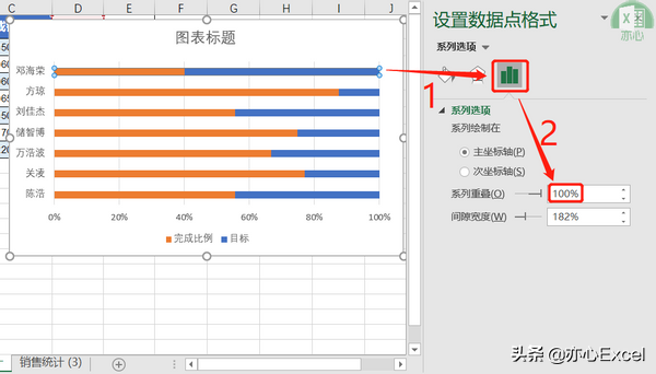 选中任意一根条形图,点击「系列选项」,设置「系列重叠」为「100%」。
