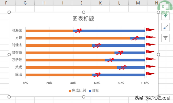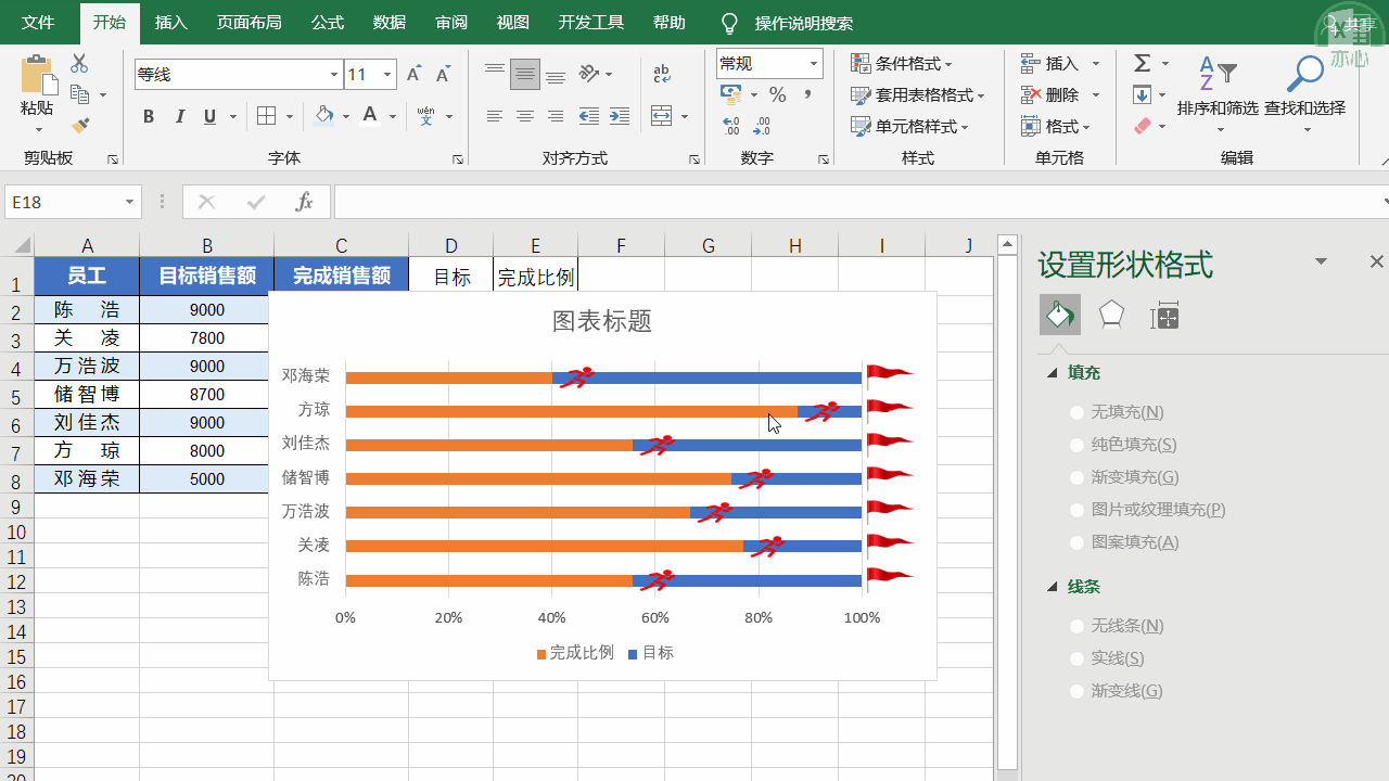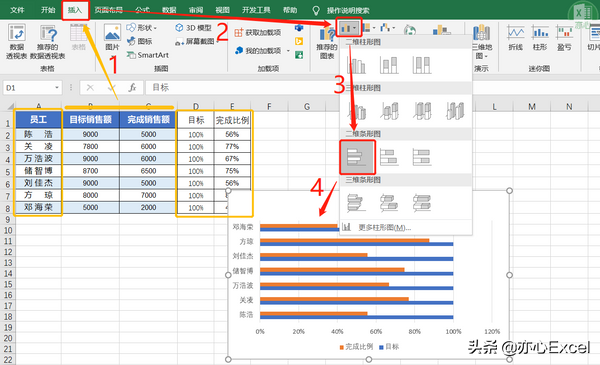 然后选中员工列、目标列,完成比例数据,点击「插入」选项卡下「图表」命令组中「插入柱形图或条形图」下拉列表下「二维条形图」中的「簇状条形图」。