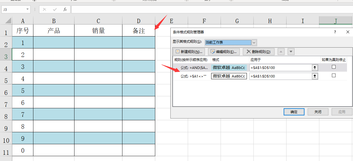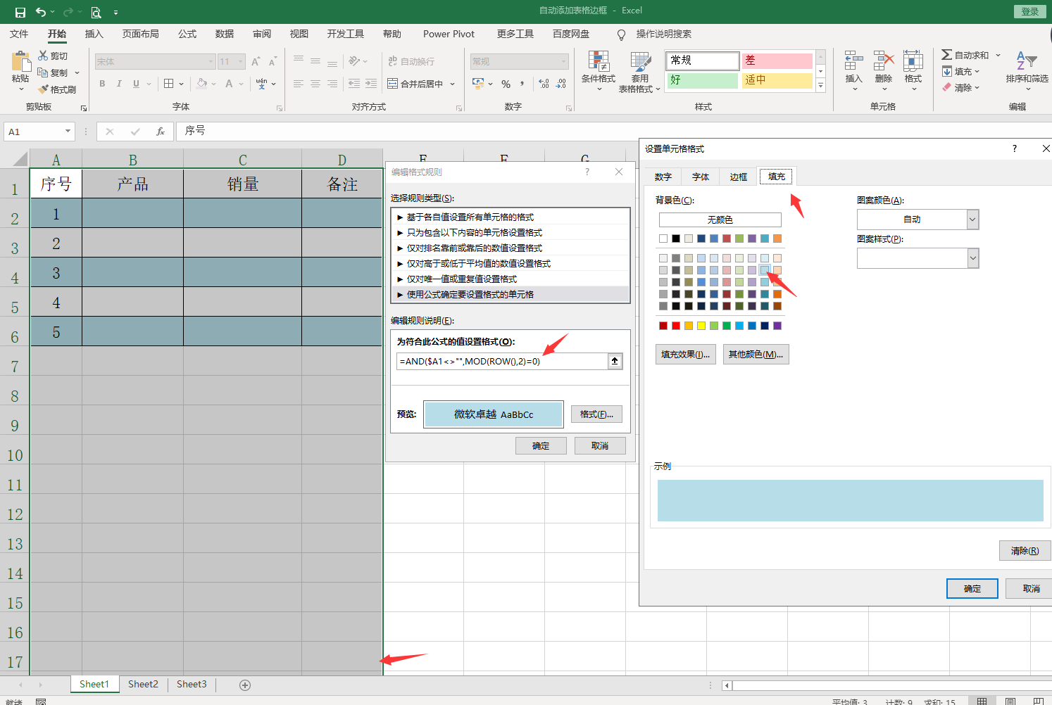 メ同理,我们同样的表格区域再设置一个条件格式,输入函数=AND($A1<>"",MOD(ROW(),2)=0),格式里面增加一个填充色。メ