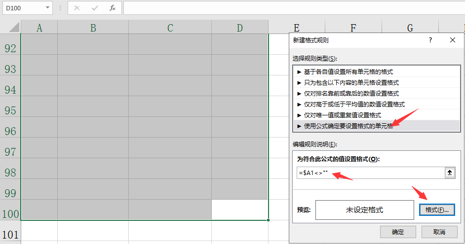 メ 选择公式设置单元格格式,输入函数=$A1<>"",点击格式设置。メ