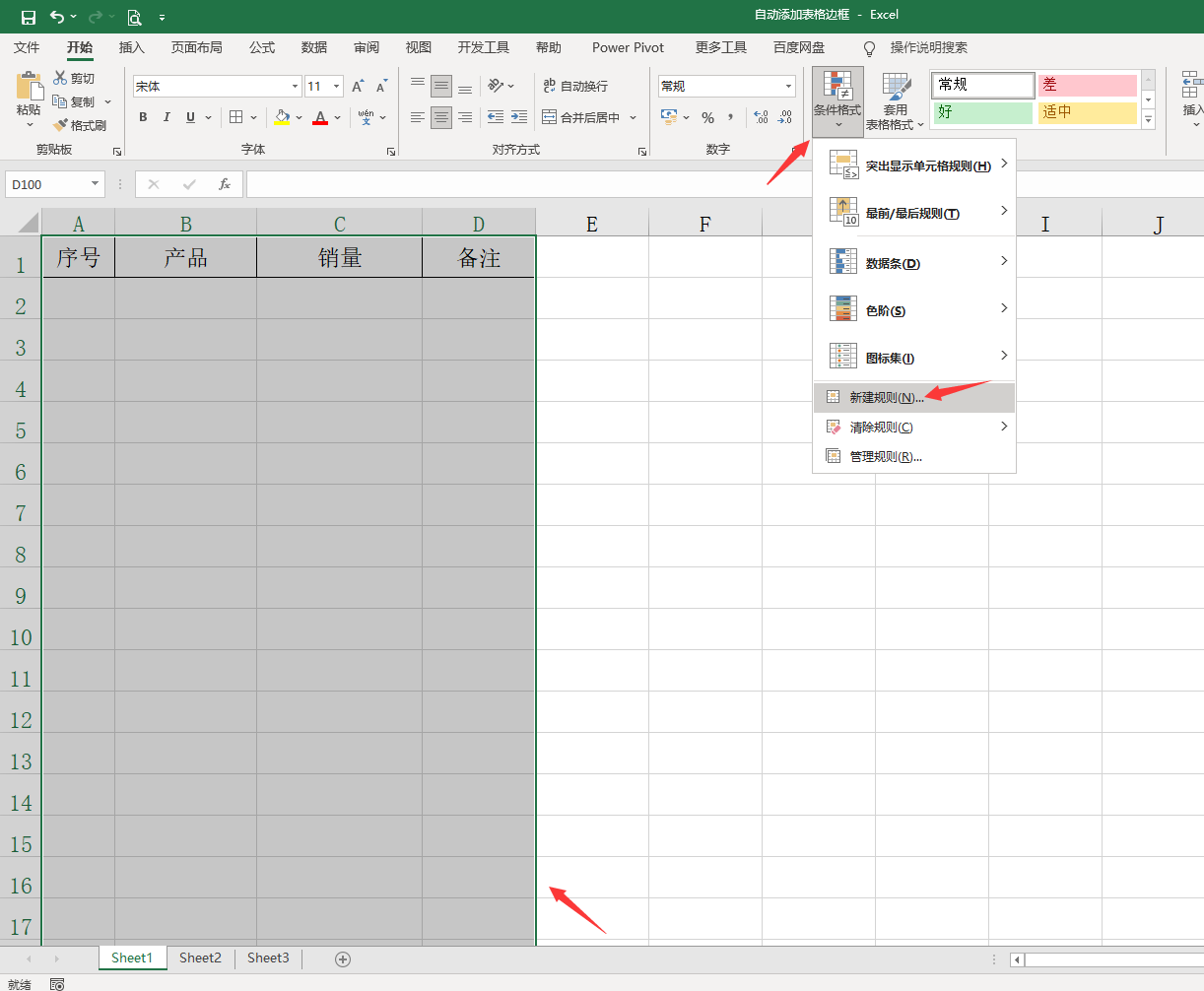 メ我们先框选表格区域(可以适当多拉一点)——条件格式——新建规则。メ