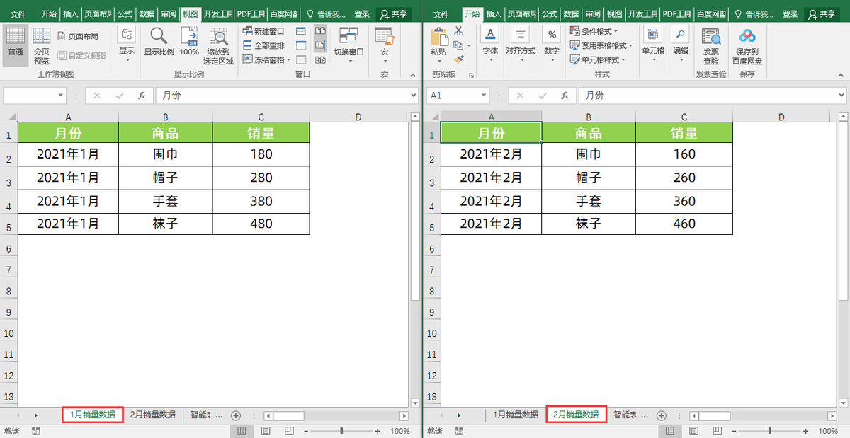 下面图1所示的工作簿中有多张工作表,其中前面两张为“1月销量数据”和“2月销量数据”,接下来我们想同步查看这两张工作表,参考效果见图2。