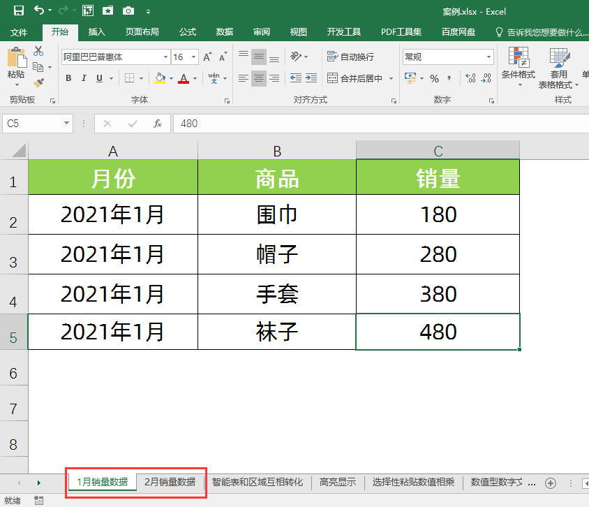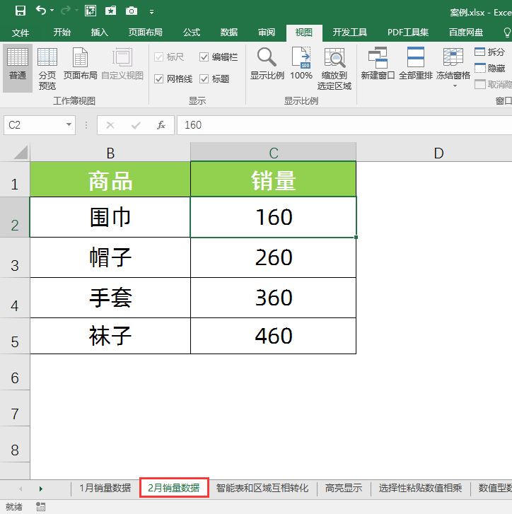 1 打开原始工作簿“案例.xlsx”,点击窗口下方的工作表标签“2月销量数据”切换到该工作表。
