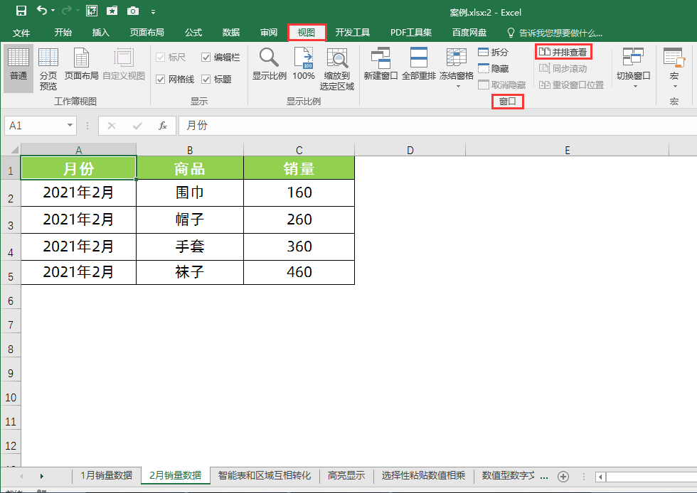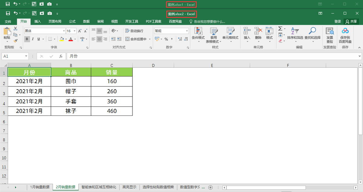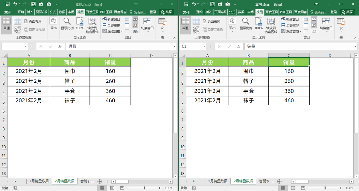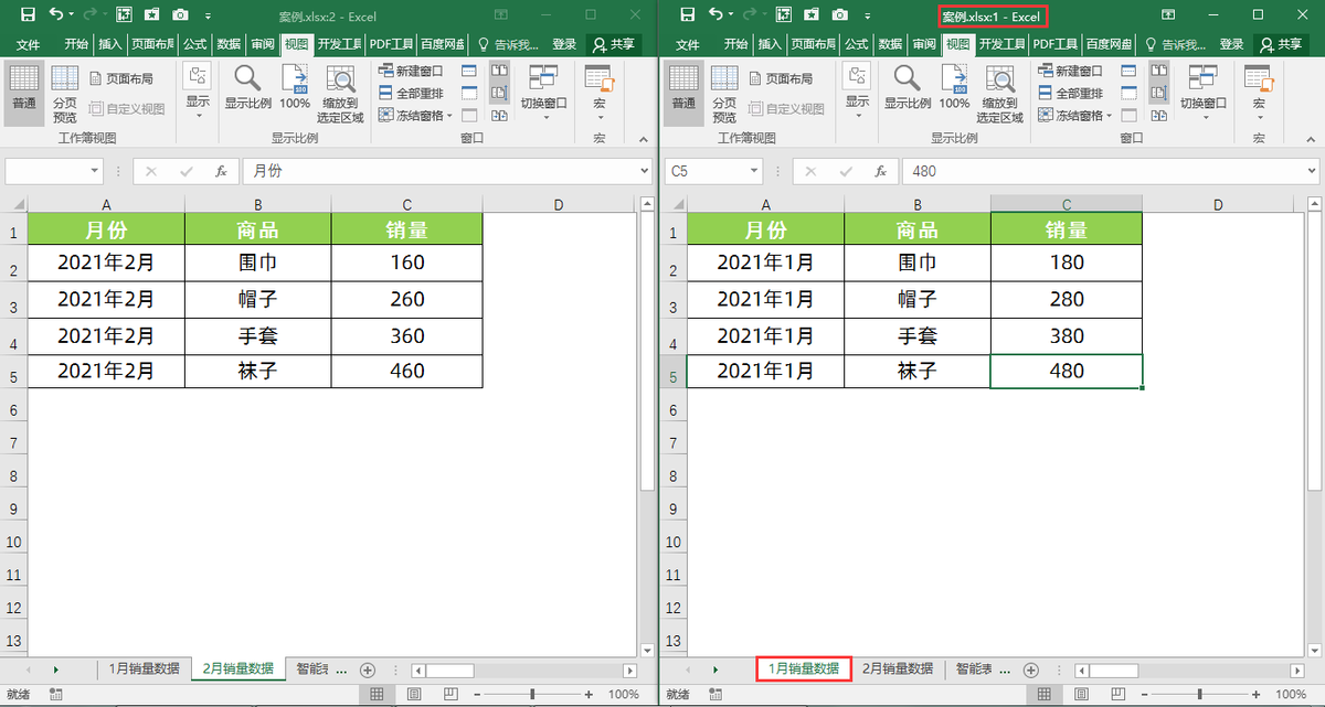 4 点击右侧工作簿“案例.xlsx:1”窗口下方的工作表标签“1月销量数据”,切换到该工作表,就能很方便地与左侧工作簿“案例.xlsx:2”窗口中显示的工作表“2月销量数据”进行同步查看了。