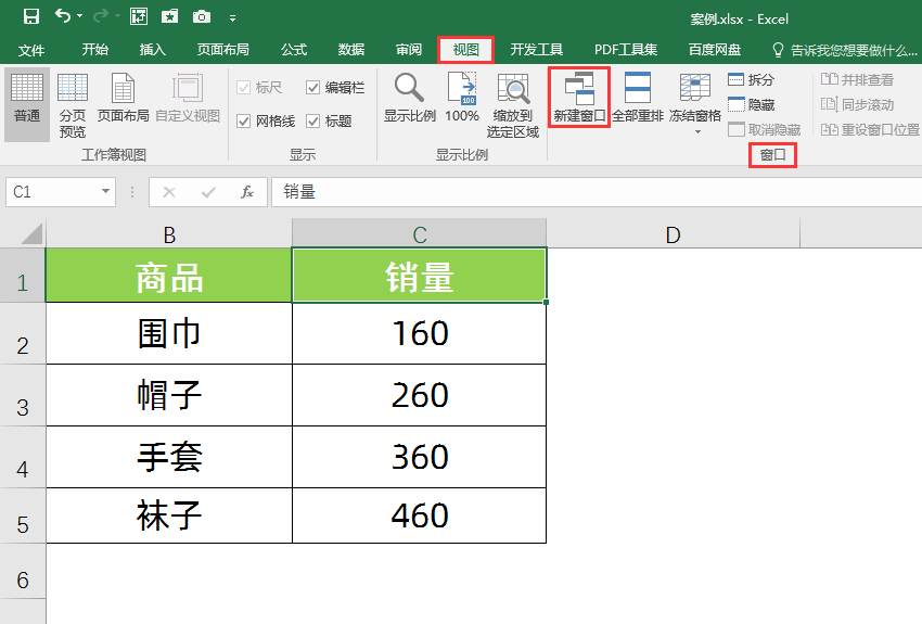 2 在“视图”选项卡下的“窗口”功能组中单击“新建窗口”按钮,此时会自动生成一个新工作簿“案例.xlsx:2”,原先的工作簿会显示为“案例.xlsx:1”。