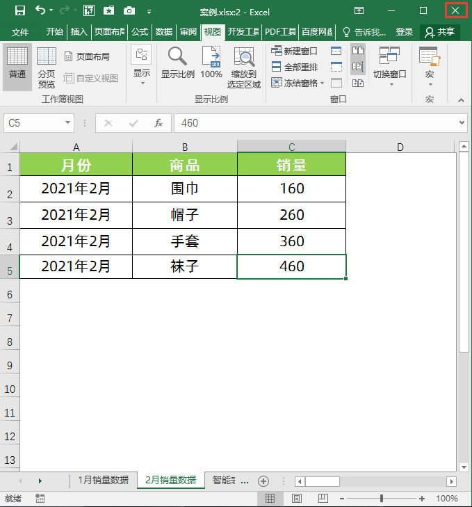 5 如果要结束同步查看状态,点击工作簿“案例.xlsx:2”窗口右上方的关闭按钮“×”即可。