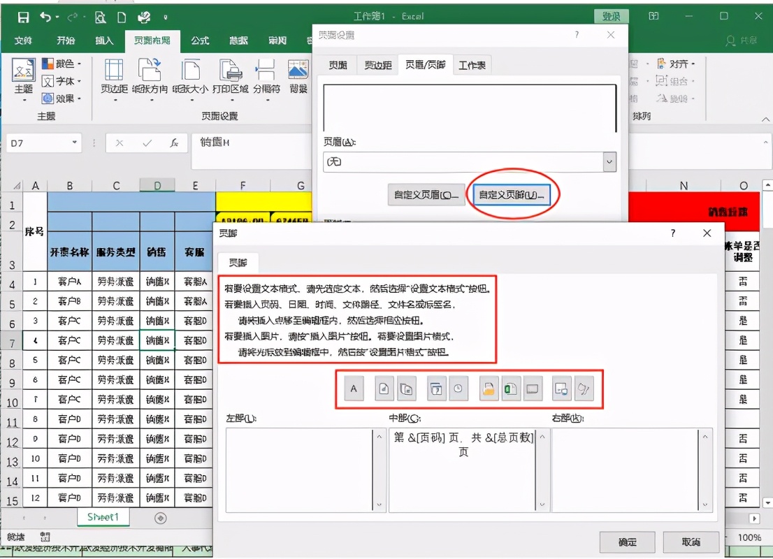 如果要添加时间和签名图片,则需要自定义页脚。如上图所示,页眉页脚上可以放置的位置有页面的左中右三个,可以添加的选项很多,点击你需要的选项即可。你也可以添加一些固定的文字。
