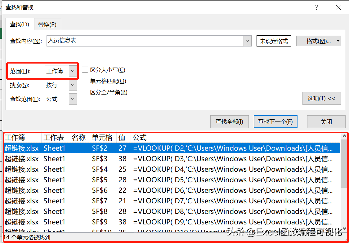 Ctrl+C 复制工作簿名称,Ctrl+F,Ctrl+V粘贴,将查找范围设置为整个工作簿,点击【查找全部】;