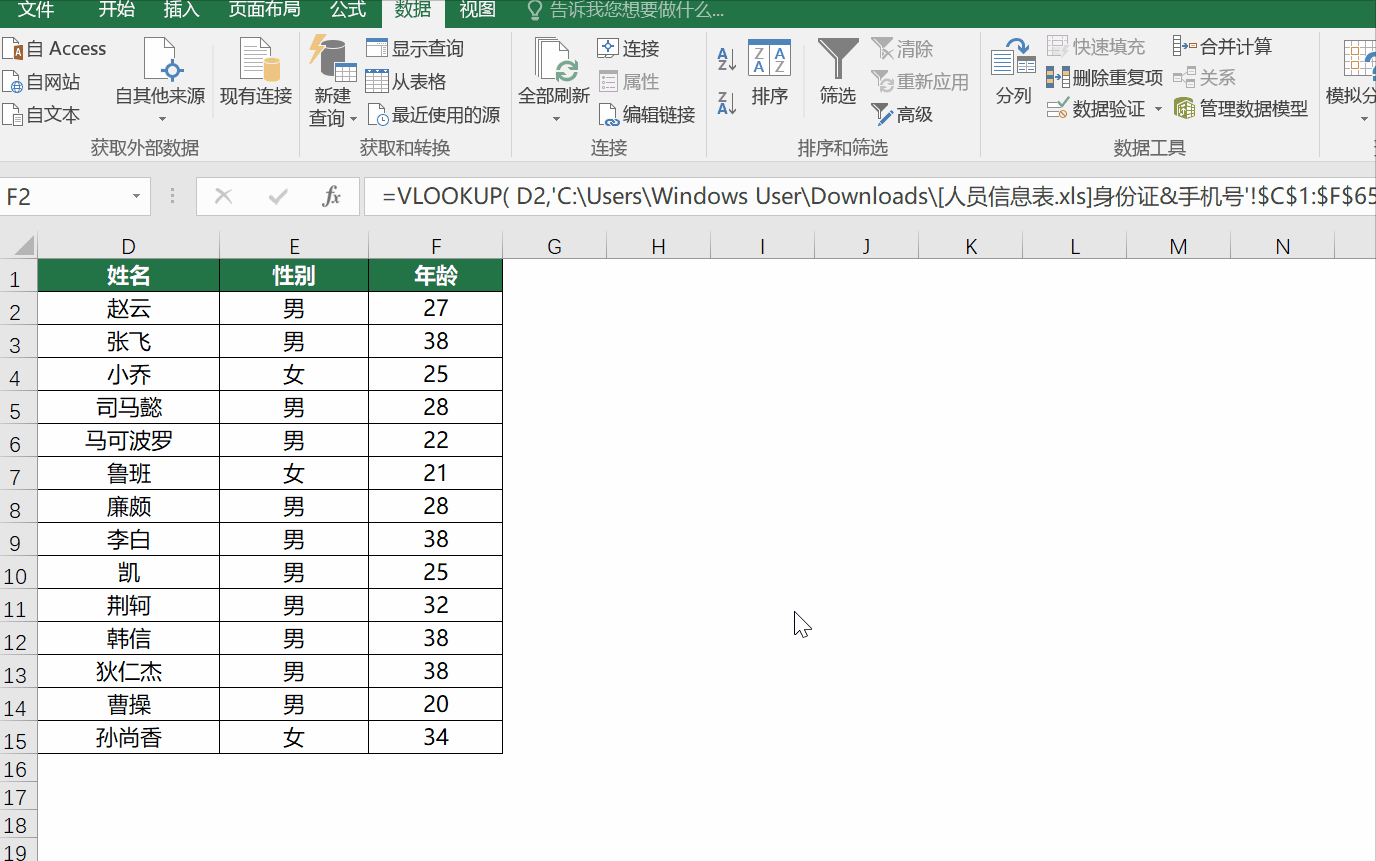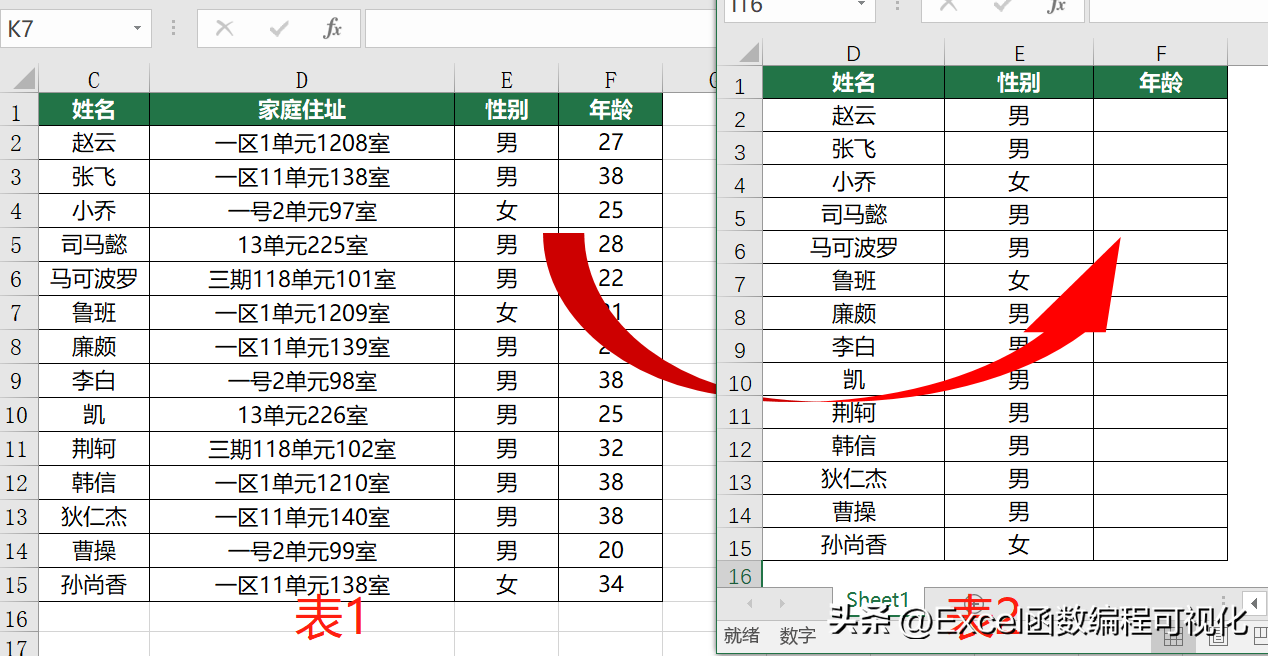 如下图中所示,我们需要将表1的年龄字段匹配到表2中去,这样表2中就会存在表1这个外部链接。