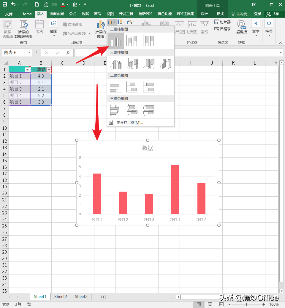 - 选中全部数据,或者选中其中一个单元格,点击插入簇状柱形图。