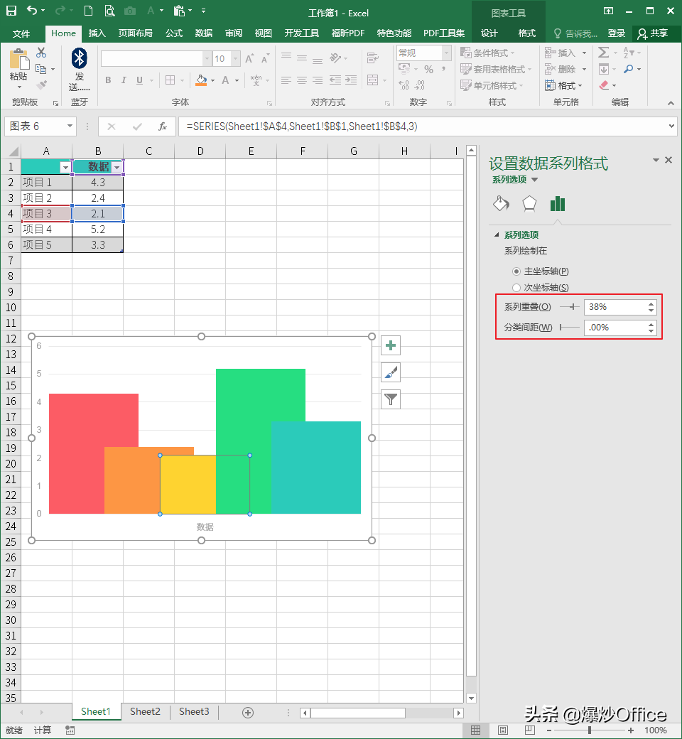 - 设置分类间距为0,增大系列重叠数值,观察柱子间距实时变化情况,确保柱子之间重叠即可,重叠程度可自己掌握,或者后续进行二次设置。