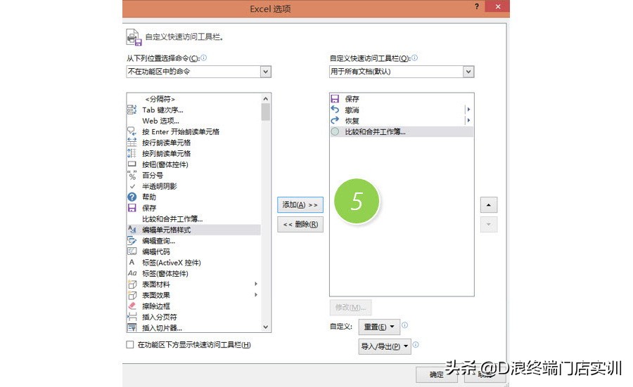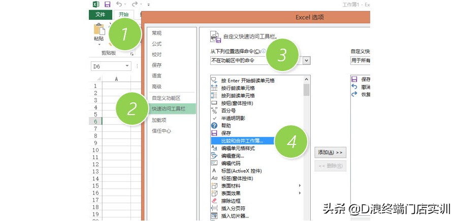 具体操作如下:在“文件-选项”中,选择“快速访问工具栏”,在不在功能区中的命令中,选中”比较和合并工作簿”按钮。下图4处
