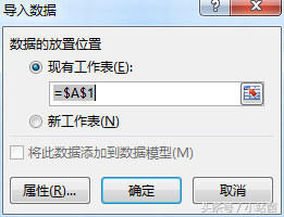 打开“导入数据”对话框,在其中设置数据的放置位置,打开“确定”按钮。