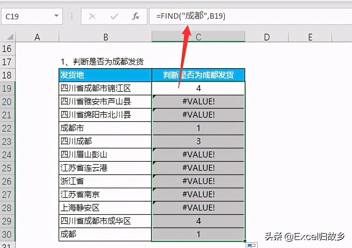 如上图所示,我们要判断发货地是否为成都,把这句话翻译一下,就是判断发货地址中是否包含成都二字。我们如何判断呢?这里给大家引入一个新函数,FIND函数,我们在后面文本函数专题会再详细的讲解,这里大家只需要明白,FIND函数的作用是找出关键字在字符串中的位置,如果字符串不包含关键字,就返回错误值。我们不是要判断是不是包含关键字吗?找出关键字的位置有什么用呢?先不着急,我们先用INFD函数找一下关键字你就明白了。