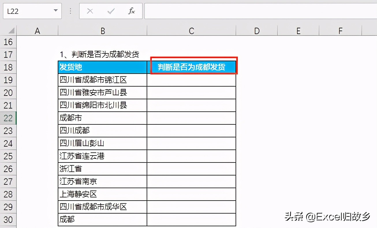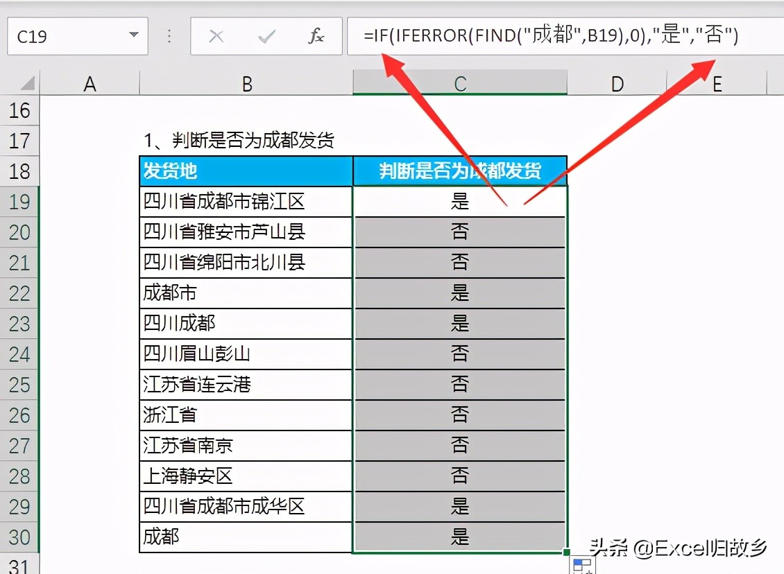 这个时候,我们包含关键字的地址对应的就是大于等于1的数字,而不包含关键字的地址,对应的就是0。此时我们联想到前面讲解的,非0的数字和0在IF函数中可以代替TRUE和FALSE,这里不正满足这个条件吗?我们正好就可以利用这个规律,将我们找出来的非0和0作为IF函数的第一参数,就可以得到我们想要的结果了,最后整理一下我们最终的公式:=IF(IFERROR(FIND("成都",B19),0),"是","否")