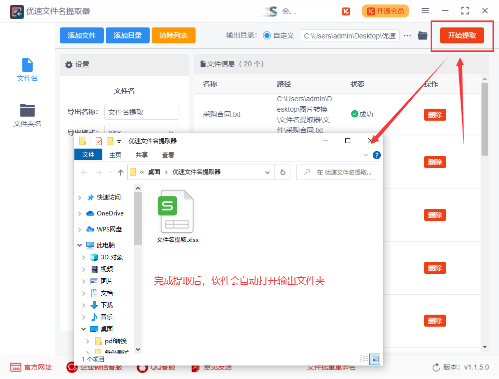 第三步,最后我们就可以点击右上角【开始提取】按钮启动软件了,完成提取后软件会自动打开输出文件夹,包含所有文件名称的excel表格就保存在这里。
