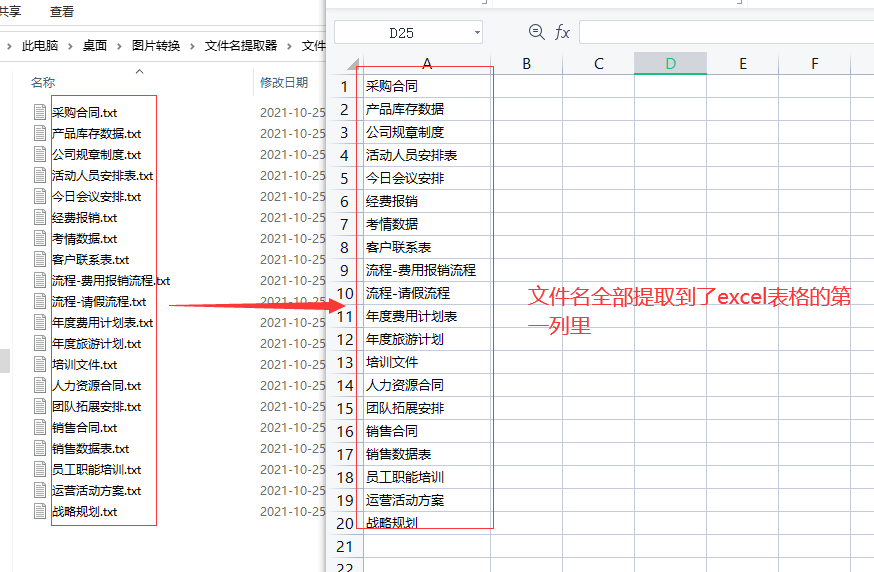 第四步,打开excel表格进行对比可以看到,成功的将所有文件名提取到了excel表格的第一列里。