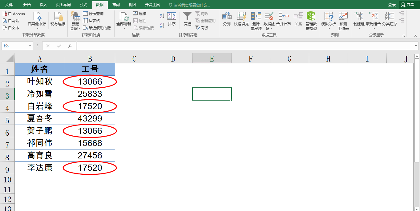 设置完成后,在不符合要求的有重复数据单元格上,都添加了红色标识圈。将单元格修改为符合规则的数据后,标识圈不再显示。