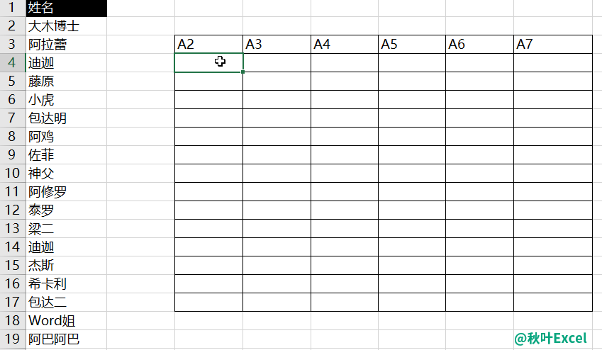 ❶ 在空白单元格输入 A2,向右填充至 A7(也就是 6 列)。