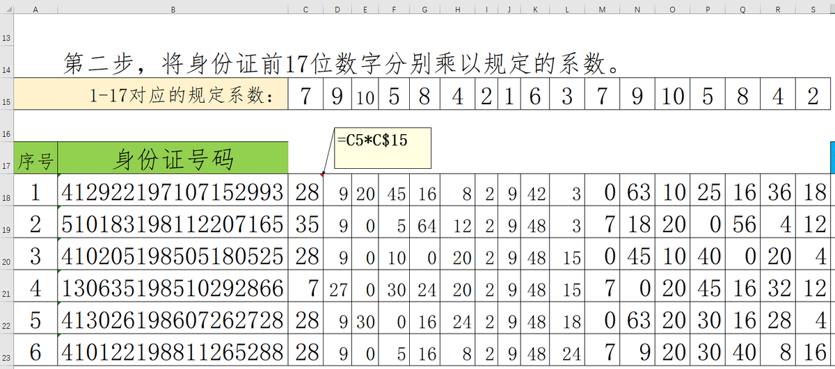 首先,需要将身份证前17位数字,分别乘以规定的系数。