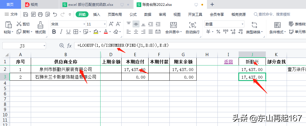 2.通过LOOKUP函数结合ISNUMBERfind函数进行模糊匹配查找:=LOOKUP(1,0/ISNUMBER(FIND(J1,B:B)),E:E)
