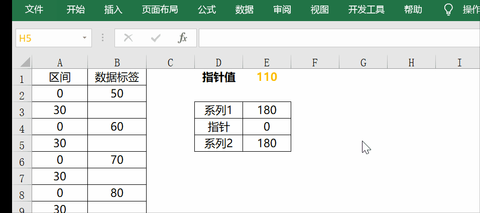 A列数据源是为了制作圆环图,B列数据标签主要是显示圆环图的刻度;E1单元格是指针的数值;下方三行数据是为了制作指针,其中系列1的值=(E1-50)*300/100,指针的值为0,系列2 的值为=360-E3-E4。