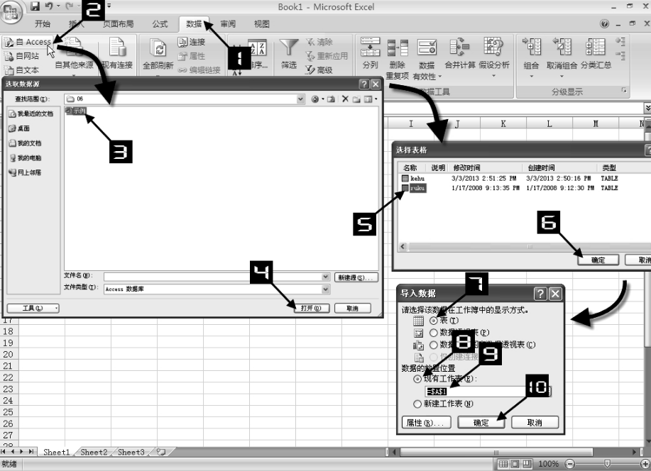 单击【确定】按钮即可导入数据,整个操作过程如图所示。