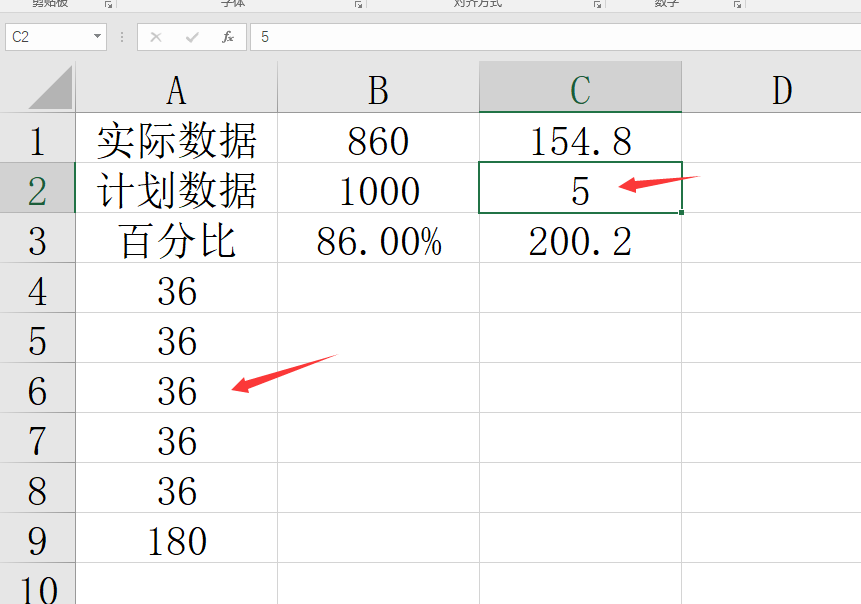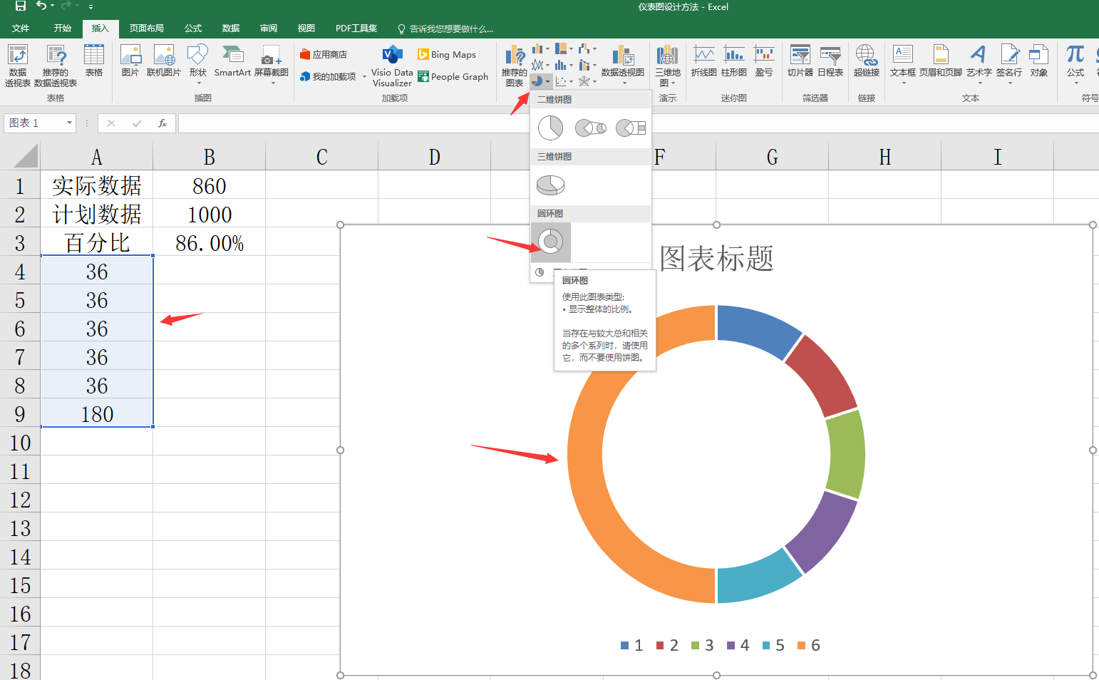 メ我们设置辅助半圆数据源,半圆分为5等分,每部分的度数就是180÷5=36。框选数据源——插入——圆环图。メ