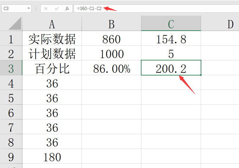 メ最后输入公式=360-C1-C2获取剩余度数。メ