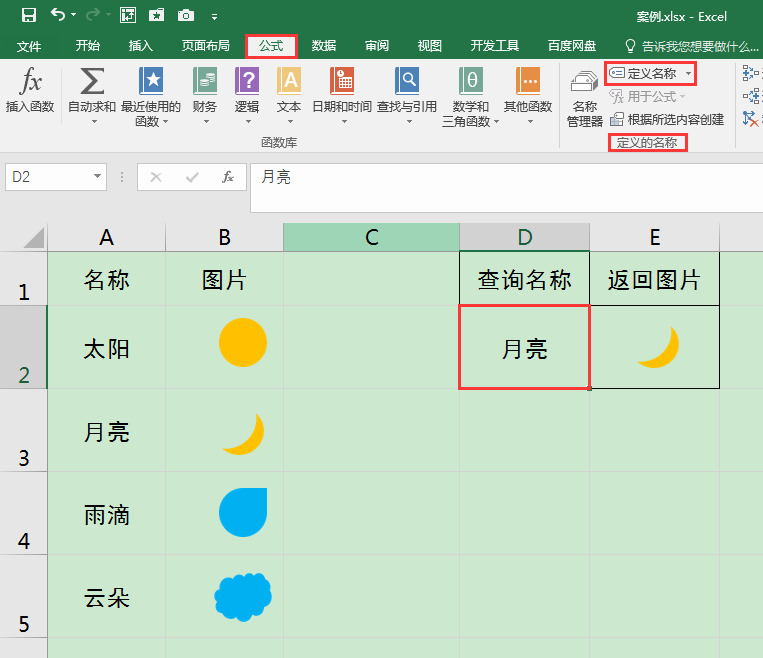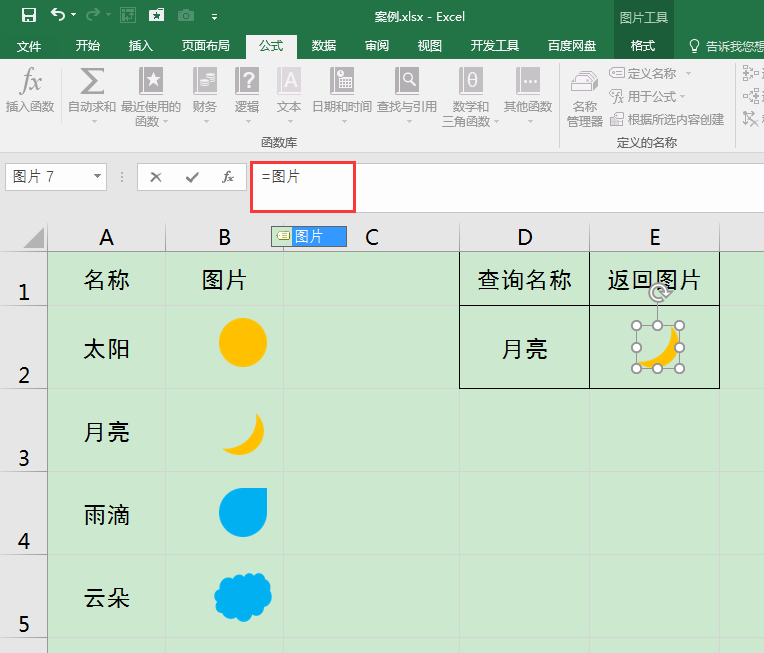 下图工作表中A列显示的“名称”与B列中的“图片”一一对应,接下来我们想实现的效果是当D2单元格中“查询名称”发生变化时,E2单元格中的图片自动切换为对应的图片。