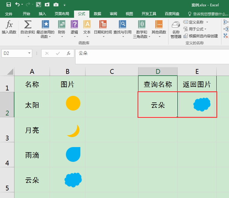 4.此时,当我们把D2单元格中的名称改为“云朵”时,E2单元格中的图片会自动切换为云朵图片。