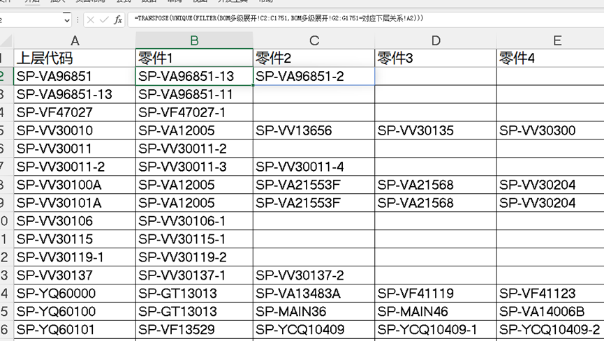 根据上面的思路,把公式更改为=TRANSPOSE(UNIQUE(FILTER(BOM多级展开!C2:C1751,BOM多级展开!G2:G1751=对应下层关系!A2))),并向下填充,就可以得到下层关系对应表了;