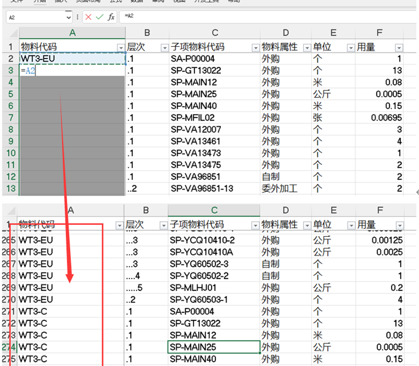此时可以用Excel的操作来解决这个问题:选中A1:A1751后,依次点:F5定位→定位条件→空值→录入公式=A2→Ctrl加回车→批量输入→选中后→复制→选择性粘贴→粘贴数值;这样就把0层和子件层对应起来了,这一步的目的就是方便后续的物料对应关系查询;
