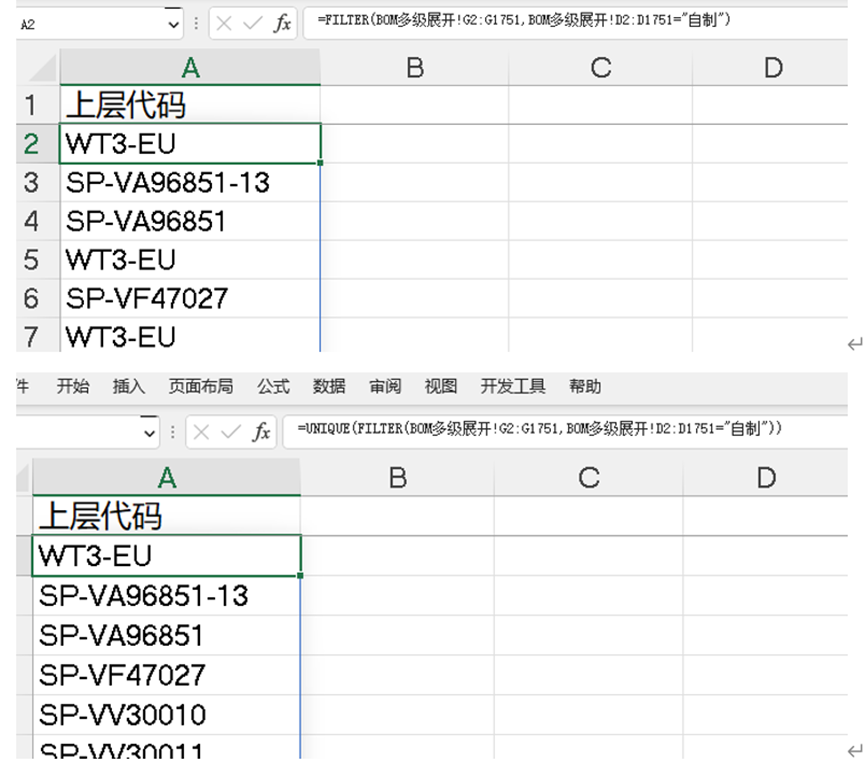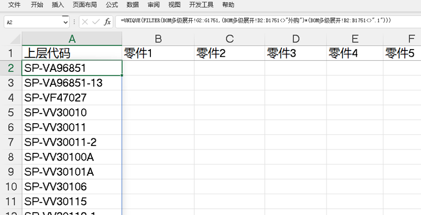 录入函数=FILTER(BOM多级展开!C2:C1751,BOM多级展开!G2:G1751=对应下层关系!A2),发现有重复项,而且还是垂直方向的,所以分别用UNIQUE和TRANSPOSE进行多次嵌套