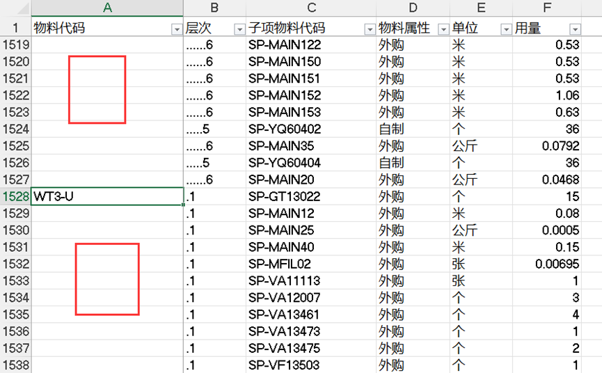 导出来发现这个系列的BOM总共展开有7层,总共子项物料代码1750个,这里需要做的第一件事就是把0层放到A列,此时发现,不同产品之间全部是空白的(ERP导出原因没有合并同类项目);