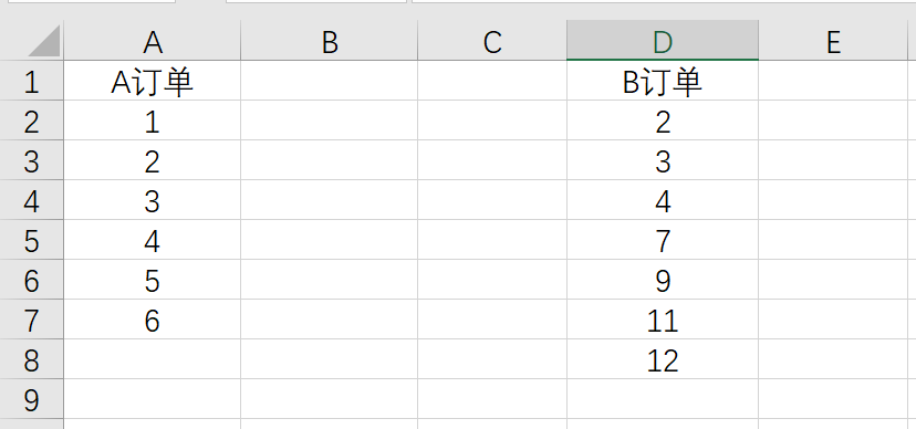 现在有两个表格,A表和B表,其中都有一列订单号码,简化的例子如下所示:
