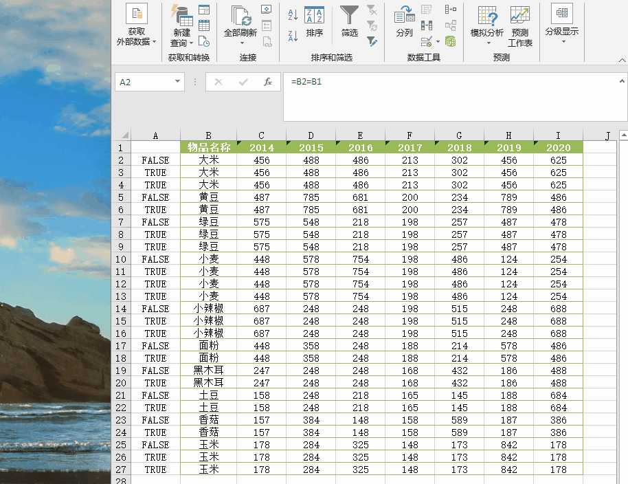 要达到这样的效果,首先需要再A列前面插入一列数据。输入公式 =B2=B1.这样会自动计算除结果是FALSE和TRUE。FALSE表示下面一行和上面一行的数据不形同。TRUE表示相同。