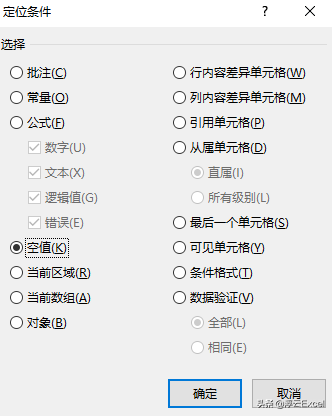 首先我们需要全选数据区域。Ctrl+G打开定位对话框,定位条件选择空值。