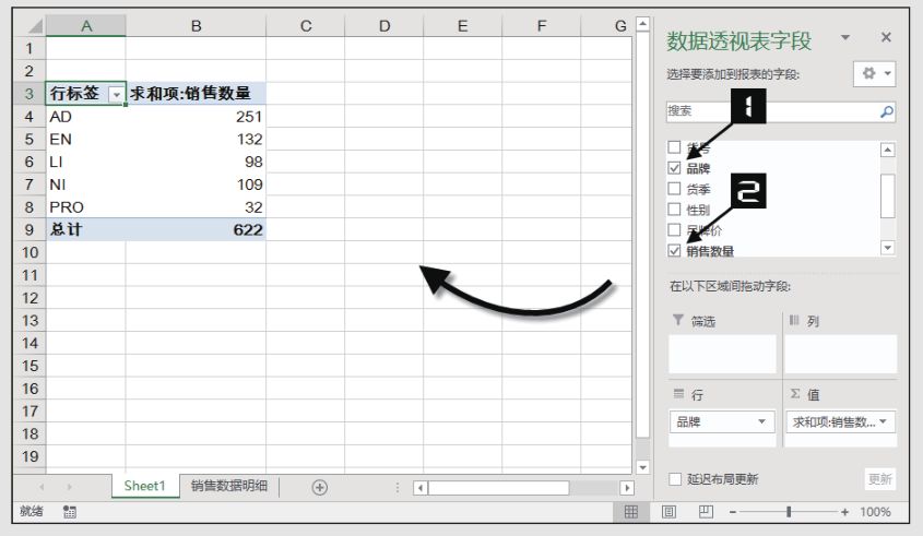 步骤3在【数据透视表字段】窗格中依次选中“品牌”和“销售数量”字段的复选框,被添加的字段自动出现在【数据透视表字段】窗格的【行】区域和【值】区域,同时,相应的字段也被添加到数据透视表中。