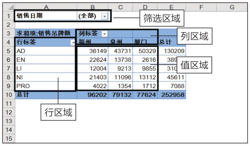 (4)值区域:此标志区域中的字段将作为数据透视表显示汇总的数据。