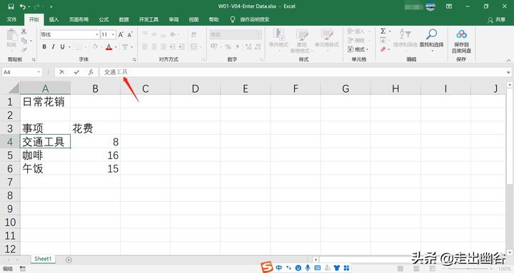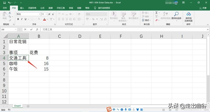 6. 按下Enter键,活动单元格会跳到A4,即下一行的首个单元格,我们继续在A4单元格中输入第一个事项,如“交通”,之后再重复之前的操作,按Tab键到B4单元格,输入对应的花费,然后再按Enter键到A5单元格,以此类推。