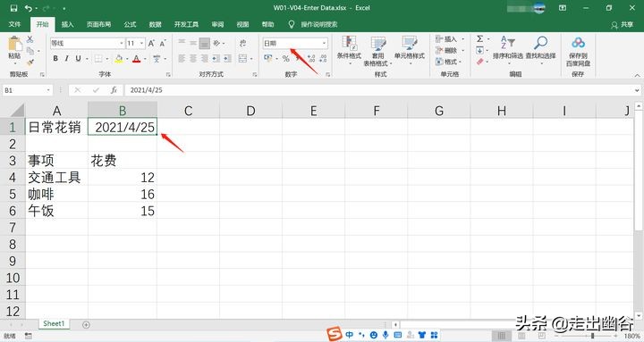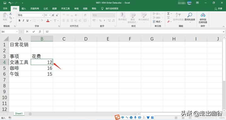 2. 如果发现已经输好的数据有错误,需要完全修改的话,如“交通”的花费实际上是“12”,则我们先点击其所在单元格B4,然后直接输入新的数据即可覆盖之前的数据。