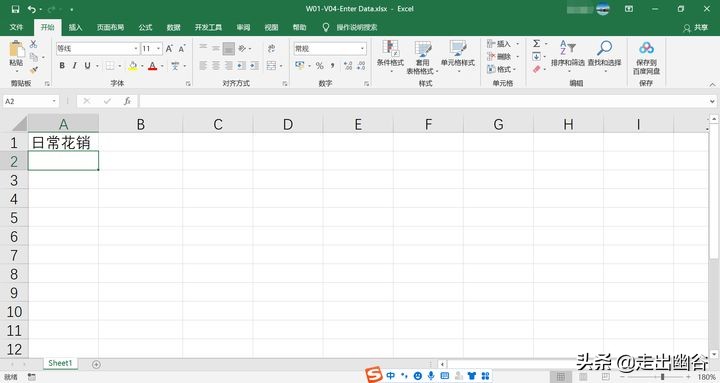 3. 在此工作表中,我们希望可以记录一下自己的日常花销,所以在A1单元格中输入“日常花销”作为数据的标题:先点击A1单元格(使其成为当前活动单元格),再输入数据,然后按下Enter键,之后会自动跳到下面的单元格A2。