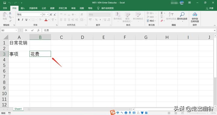 5. 在“事项”的右侧单元格B3中,我们要输入“花费”,此时我们按下Tab键,活动单元格就会从A3到B3,然后在B3中输入相应的标题。